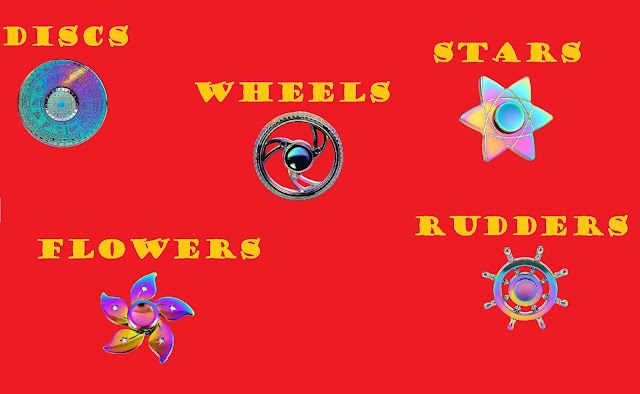 In this pic you can see some examples of “Shape” spinners. In this picture, you see Wheels, Discs, Stars, Flowers & Rudders; but let me also point out… These are not the only shapes that get repeated with different designs, but they’re a good way to help illustrate why I separate the two main types.