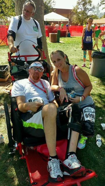 This photo shows Regan with a young man who was unable to compete due to a terrible motorcycle accident. 13 volunteer runners pushed him in 1 mile intervals for the entire course and helped him cross the finish line using a walker. This is a true sportsman who didn’t want to give up his opportunity to compete and is also an awesome story of sportsmanship from the runners who helped him achieve his goal. Our hats are off.