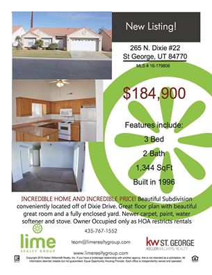 LIME REALTY GROUP can’t wait to share this one with you! Located at 265 N. Dixie Dr. #22, this St. George home in the lovely Springfield Estates subdivision, this 3 bedroom, 2 bath home is 1,344 sq. ft. and is an incredible steal at $184,900.