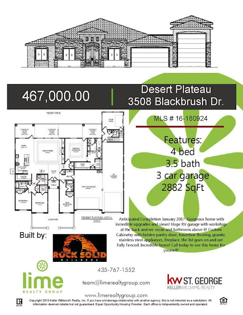 3508 Blackbrush Dr., in St. George, UT will be finished and ready for move in this month!  This 2882 SqFt home features 4 bedrooms and 3 and a half baths.  It also includes a 3 car garage with huge RV space and workshop in the back.  There’s a rec room and bathroom above it as well.