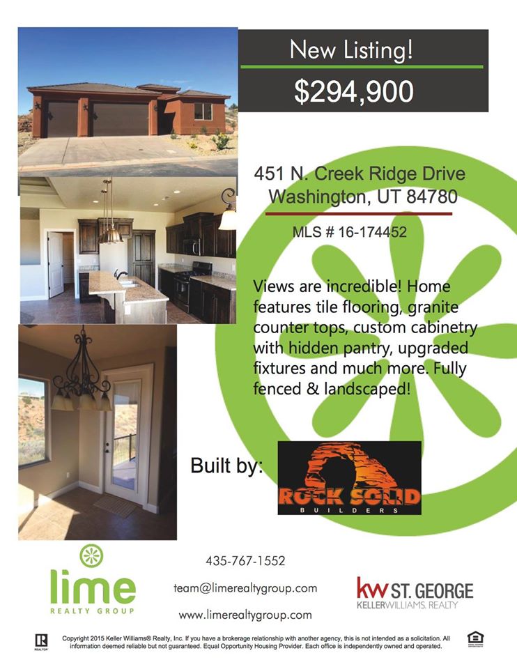 LIME REALTY GROUP is pleased to show you our new featured property! Located at 451 N. Creek Ridge Dr., in Washington, UT, this home includes an unfinished basement. Located in the amazing Millcreek Springs subdivision with incredible views, the home features tile flooring, granite counter tops, custom cabinetry with hidden pantry, upgraded lighting fixtures and much, much more.