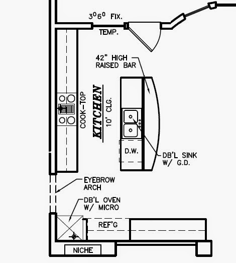 The very first thing you need is a blueprint. A plan. This particular plan was loaded will all kinds of instructions, but we’ve edited out all of them and left only information that is important to the design behind. The plans give us a lot of information we need when we start designing. It tells us where the appliances need to go and what kinds of appliances are going to be in that kitchen. For example, this kitchen calls for a sub-zero refrigerator. The standard size for home refrigerators is 36″. This one is calling for a 48″ space so we know it’s a sub-zero. We also know roughly where other things like plugs and pipes are going to go because of where the architect puts the sinks, etc. etc.